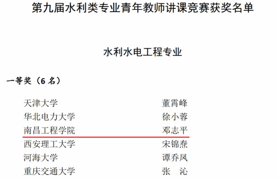 近日,中国水利教育协会公布《关于公布第九届水利类专业青年教师讲课竞赛结果的通知》,我校水利工程学院青年教师邓志平、吴强与全国84所院校的167名优秀青年教师同台竞技,分别获得水利水电工程专业组一等奖和水文与水资源工程专业组三等奖的好成绩。