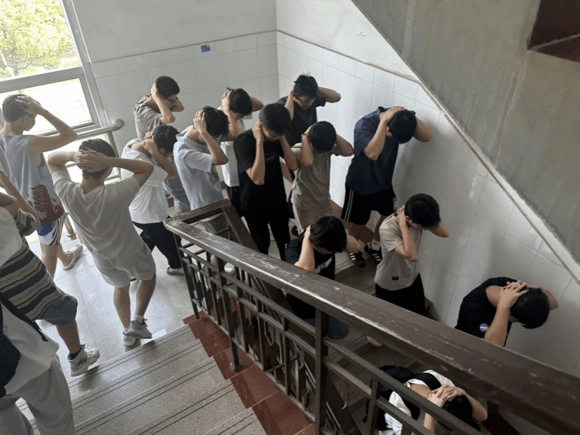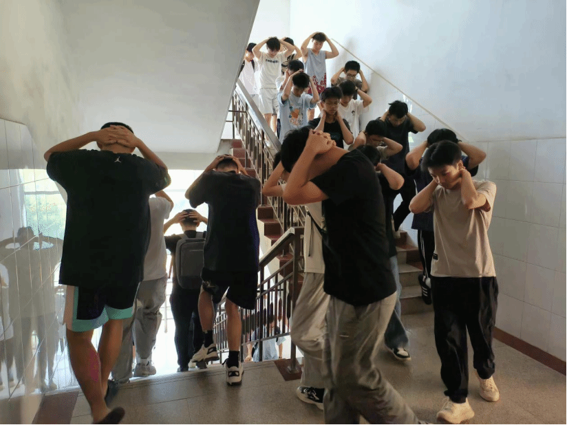 本次防灾演习中,我院学生根据地震标准求生姿势,将身体尽量蜷曲缩小,双手交叉放于脖后,保护头部和颈部,等待逃生时机,快速有序地逃离逸夫水利楼。