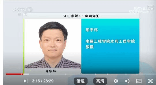 在举国欢庆中华人民共和国成立75周年之际,我校水利工程学院陈宇炜教授受邀登上中央电视台10月2日“地理中国-江山多娇3-斑斓湖泊”节目,介绍我国最具有特别代表性也是国内第一大淡水湖的通江湖泊-鄱阳湖的水生态环境现状,结合学校水生态环境团队长序列湖泊湿地监测研究成果,给全国人民科普了保护鄱阳湖“一湖清水”的重要性和紧迫性,也向全国观众展示了南昌工程学院教师的专家风采。(文/任文静 图/陈宇炜)