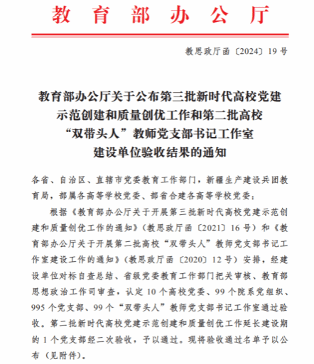 近日,教育部办公厅公布了第三批新时代高校党建示范创建和质量创优工作和第二批高校“双带头人”教师党支部书记工作室建设单位验收结果,水利工程学院水利水电工程教研室党支部顺利通过第三批“全国党建工作样板支部”建设单位的验收。