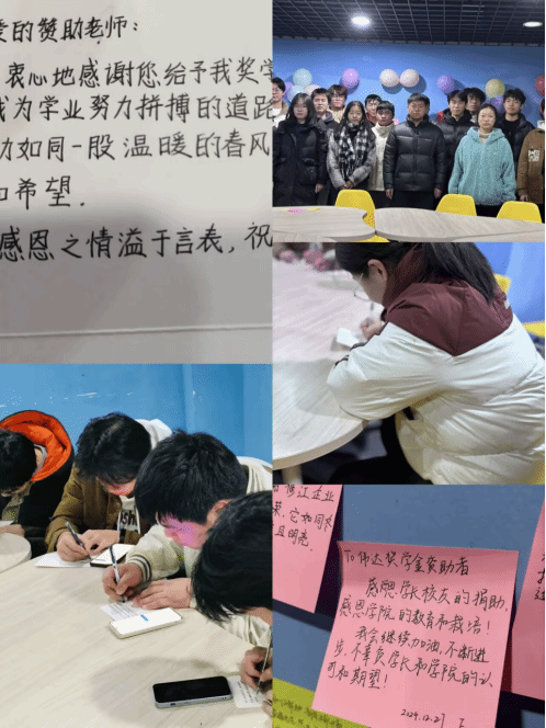 为培养学生自立自强、知恩感恩的良好品质,12月27日,水利工程学院在学生公寓15栋阅读室开展感恩祝福活动,80余名受助学生以书信形式抒发对国家、学校以及校友奖学金资助者的感激之情。