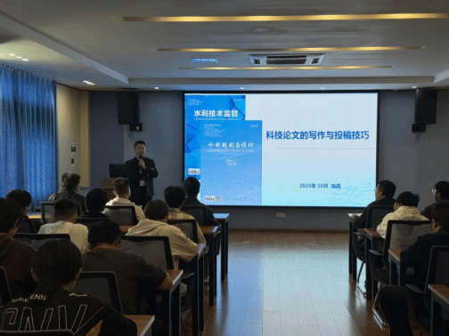 10月31日下午,“科技论文写作与投稿技巧”专题讲座在逸夫水利楼B400举办。水利部水利水电规划设计总院期刊部主编温立成教授受邀作专题讲授,70余名硕士研究生参加活动。