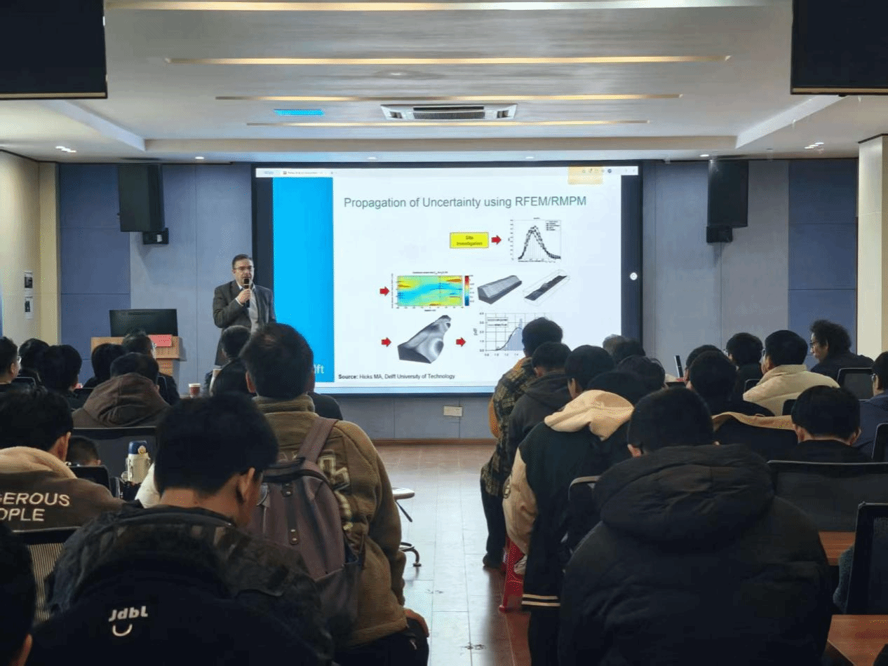 Michael Hicks教授作题为《Application of the random finite element and random material point methods to slope stability assessments》的学术报告。他聚焦土体空间变异性对边坡稳定性的影响,系统介绍了基于蒙特卡洛框架的随机有限元法的防洪堤、公路/铁路路堤等线性基础设施边坡的二维、三维建模方法,并结合两个区域堤坝案例,阐释了该方法在实际工程中的应用逻辑。针对大变形边坡稳定问题,介绍了随机场与物质点法结合形成的随机物质点法(RMPM),以及在堤坝残余抗灾能力分析、敏感黏土渐进式滑坡三维演化模拟中的实践价值。报告结束后,与会师生同Michael Hicks教授进行互动交流,现场学术氛围浓厚。