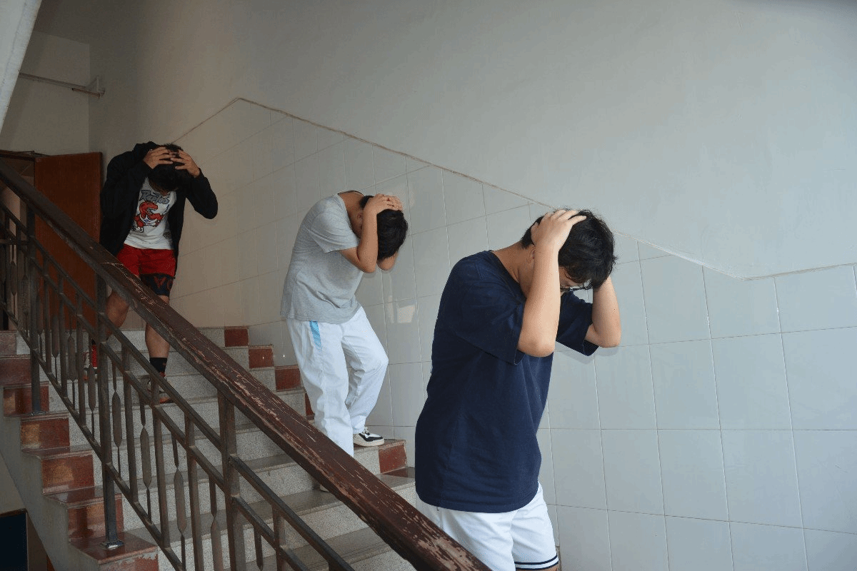 本次演习中,我院学生根据地震标准求生姿势,将身体尽量蜷曲缩小,头尽量向胸靠拢,双手交叉放于脖后,保护头部和颈部,等待逃生时机,快速有序地逃离逸夫水利楼。
