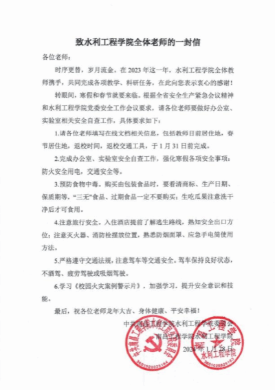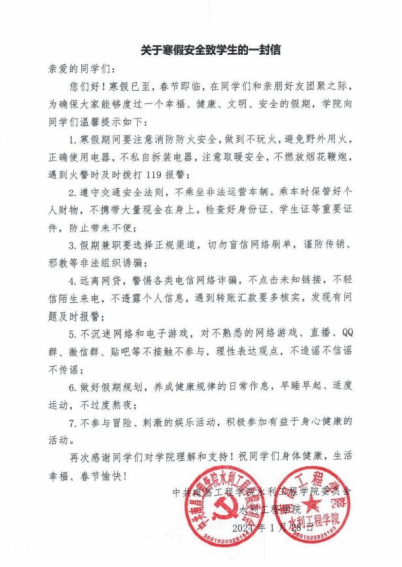 29日,学院发出《致水利工程学院全体老师的一封信》《关于寒假安全致学生的一封信》,强化寒假期间防火安全、食品安全、交通安全及财产安全等各项工作。(文/图 张阳)