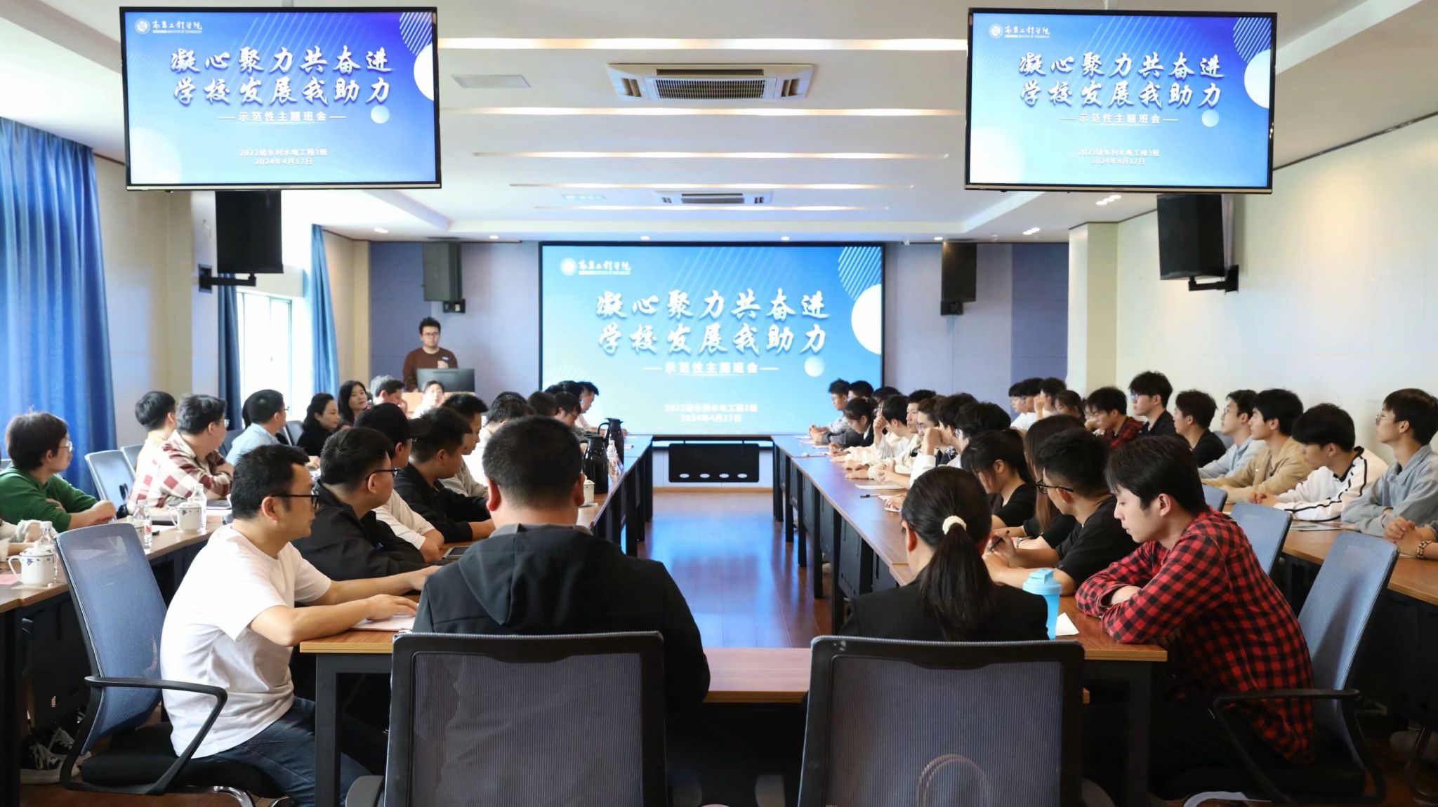 4月17日,水利工程学院2022级水利水电工程3班在逸夫水利楼B400开展“凝心聚力共奋进,学校发展我助力”示范性主题班会。党委宣传部、学生工作处、水利工程学院等单位负责人,各学院党委副书记、学生工作办公室负责人、辅导员代表参加活动。