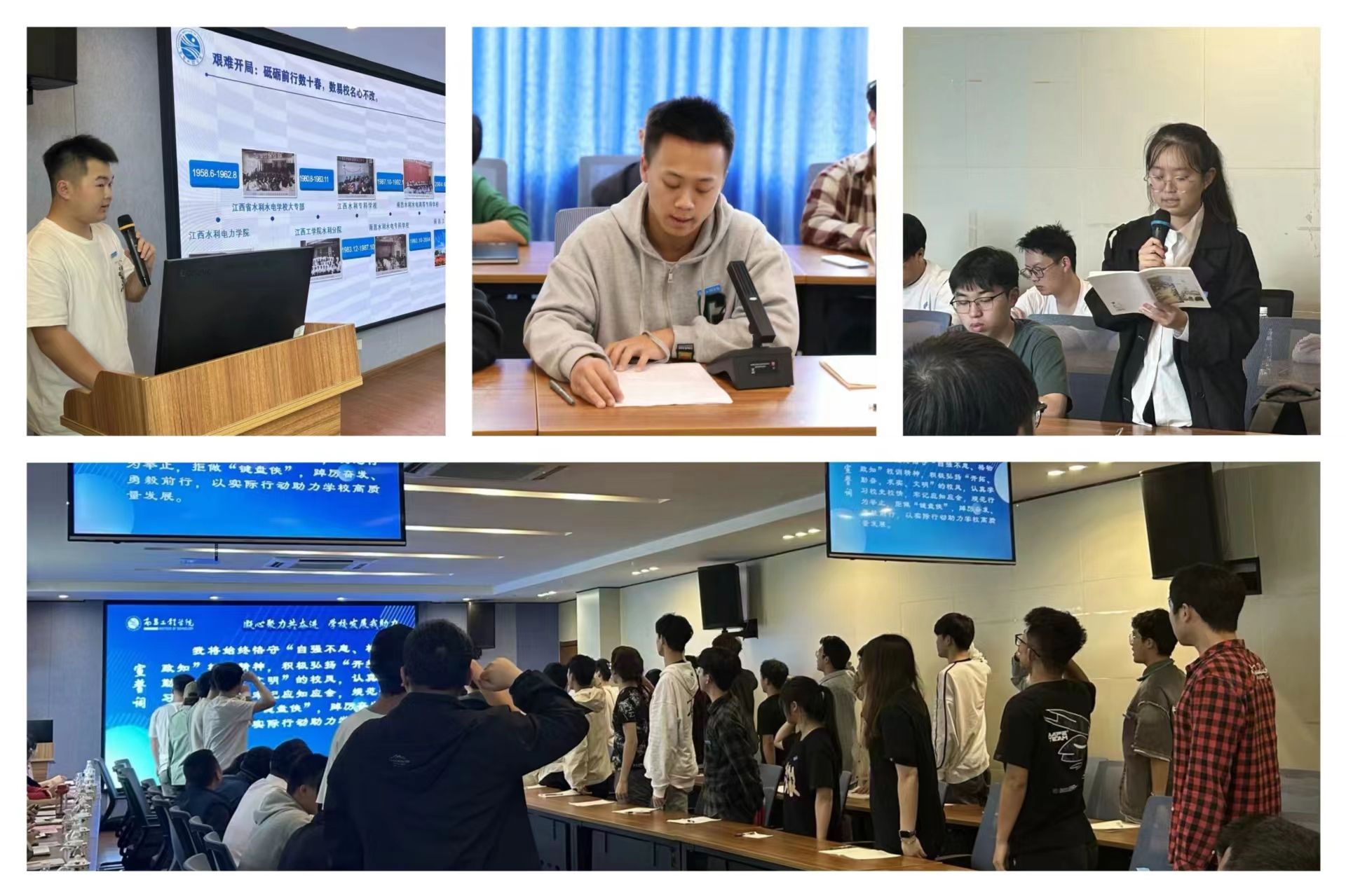 此次班会共分为三个环节。在“知校情明校史,共忆峥嵘岁月”环节,通过学生代表的PPT展示分享,大家深入了解学校接续奋斗的发展历程和令人瞩目的辉煌成就。在“谈认识话感悟,共谋成长之路”环节,2020级水利水电工程4班的胡裕龙、2021级水利水电工程5班的葛述灏作为朋辈代表,分享个人成长历程以及伴随学校快速发展自身的收获和感悟;2022级水利水电工程3班万诗雨、邓文超等2名同学围绕“初心、使命、愿景”等关键词,畅谈对学校高质量发展的美好愿景,邓文超带来原创诗歌《我眼中的大学》。在“明规矩守底线,共聚青春力量”环节,班级同学集体诵读班级行为规范顺口溜并共同宣誓:始终恪守“自强不息、格物致知”校训精神,积极弘扬“开拓、勤奋、求实、文明”的校风,认真学习校史校情,牢记应知应会,规范行为举止,拒做“键盘侠”,踔厉奋发、勇毅前行,以实际行动助力学校高质量发展。班会在校歌声中结束。