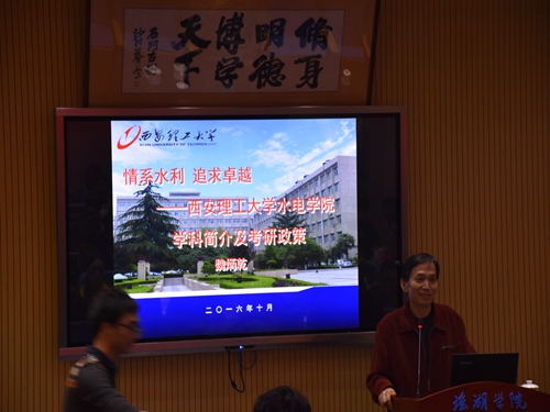 10月14日-16日,西安理工大学水利水电学院水力学及河流动力学研究所所长魏炳乾教授及专业骨干教师一行5人来我院进行了考察交流。学院张修祥书记、农水教研室相关教师裴青宝、潘延鑫等参加座谈会。双方就实践教学、人才培养、考取研究生和工程训练、实验室建设中的相关问题进行了深入交流。我院一直以来注重与其他高校及相关科研院所的学习交流。来访人员对我院实践教学和创新训练的软硬件建设、实践教学和学生创新训练等方面取得的成果和做法给予了高度评价。一致约定,今后要继续保持密切联系,加强交流合作,携手共同发展。考察期间魏炳乾教授对西安理工大学水利水电学院学科及考取研究生方面做了专题报告,候精明教授还为相关师生做了题为海绵城市建设理念与方法及高性能模拟技术应用的精彩学术报告,我院对魏教授一行的到来表示热烈的欢迎和衷心的感谢!