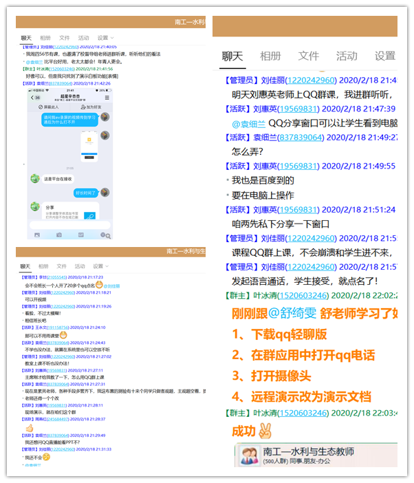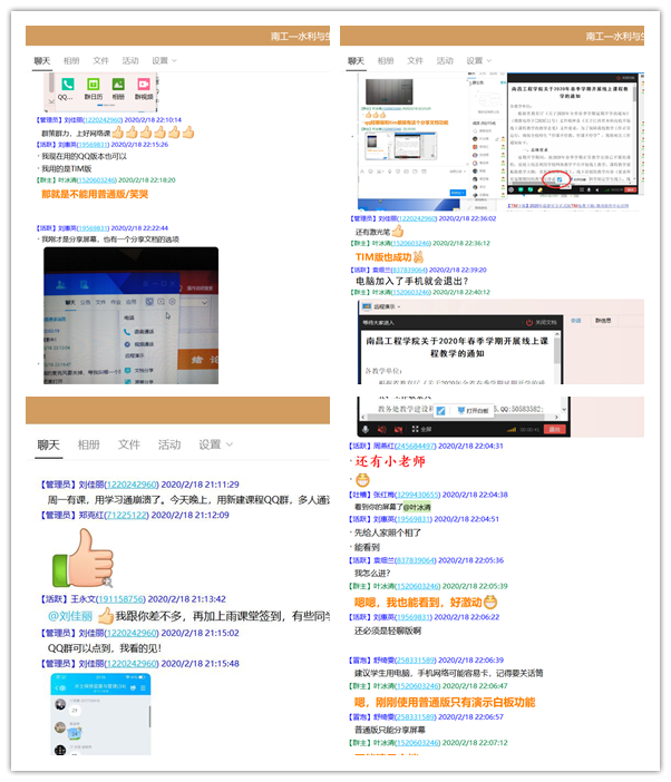经过两天的线上教学运行,一些在线平台由于访问量过大而出现暂时性故障,老师们也及时根据使用情况不断地总结经验。为了保障线上教学的顺利开展并取得较好成效,围绕如何更好地运用QQ群开展线上教学活动,学院刘佳丽、叶冰清、舒绮雯、刘惠英、王永文、袁细兰、张红梅、周燕红、李甘、郑克红等老师持续研讨到深夜。此外,学院教学督导工作也有序开展,学院领导、教学督导员分别加入课程群跟听线上课,帮助老师们上好线上课。(文/另青艳 图/叶冰清)